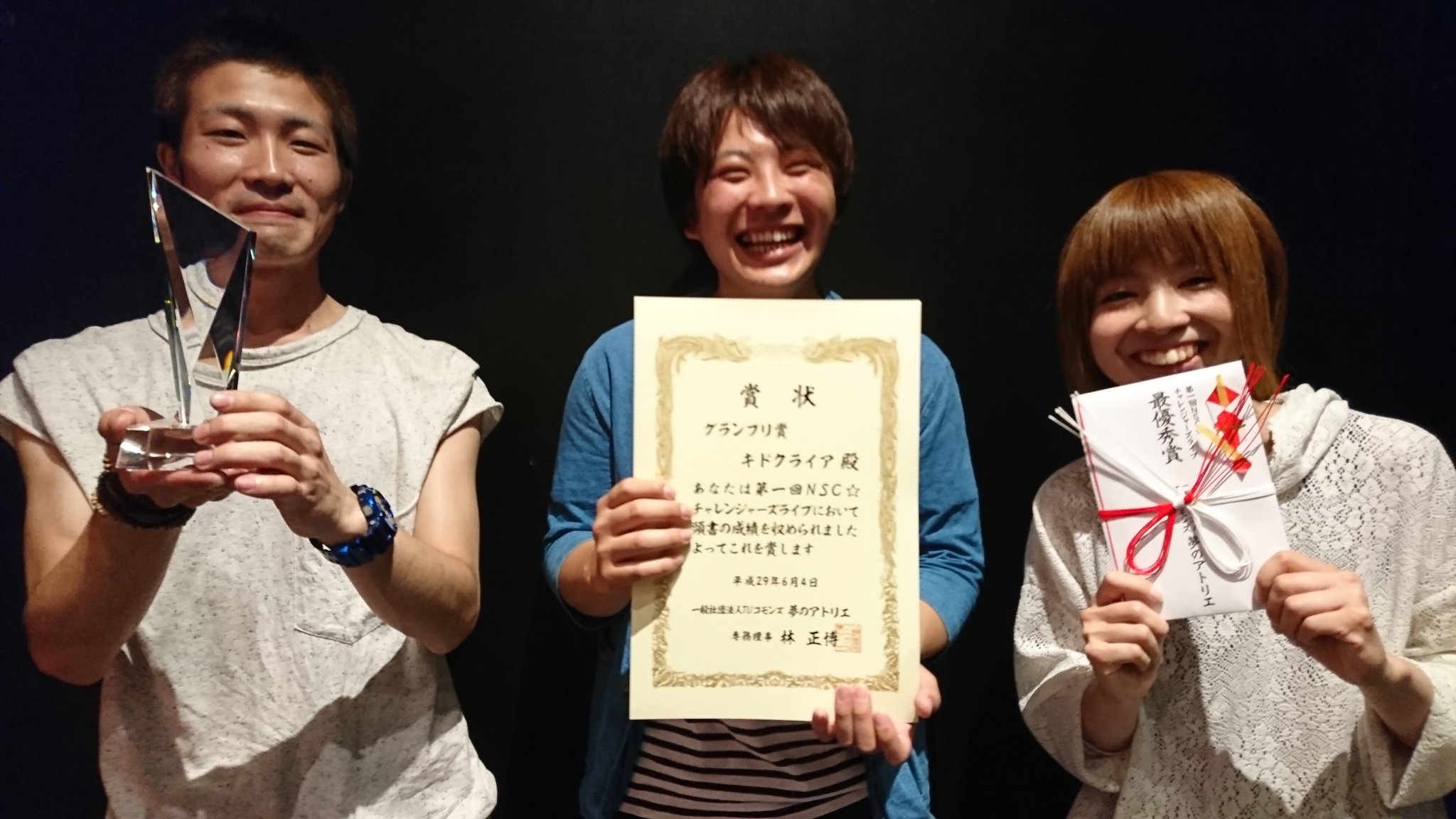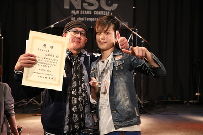 「第4回NSGチャレンジャーズライブで優勝しました!!応援に来てくれた皆さん、本当にありがとうございました。そして、審査員の皆さんにも感謝です。JAYWALKのお二人にお会いできてムチャクチャ嬉しかった。」